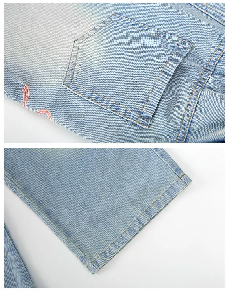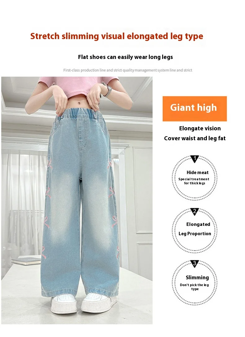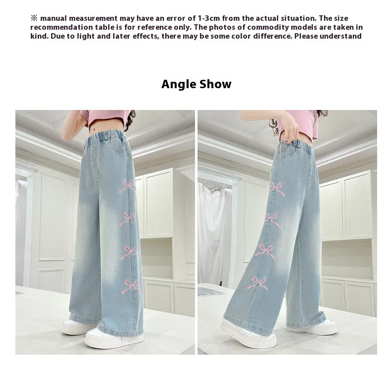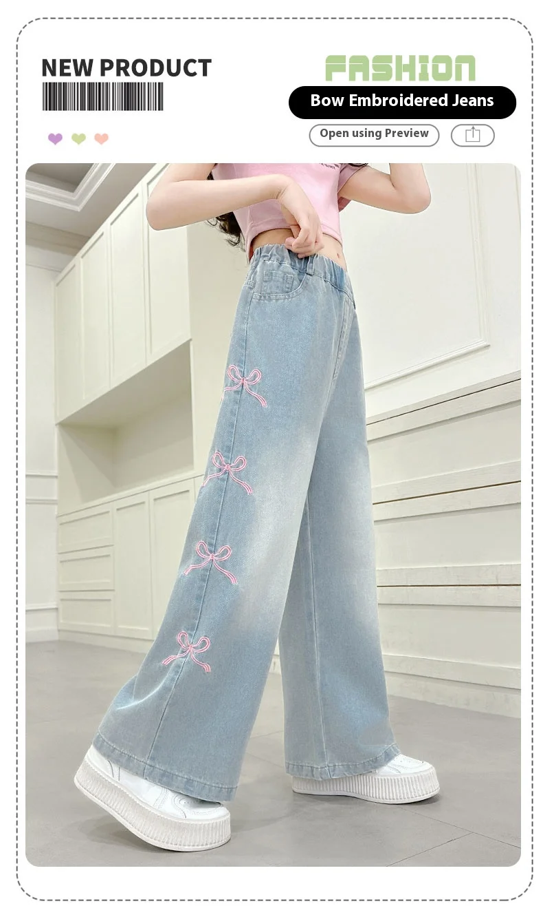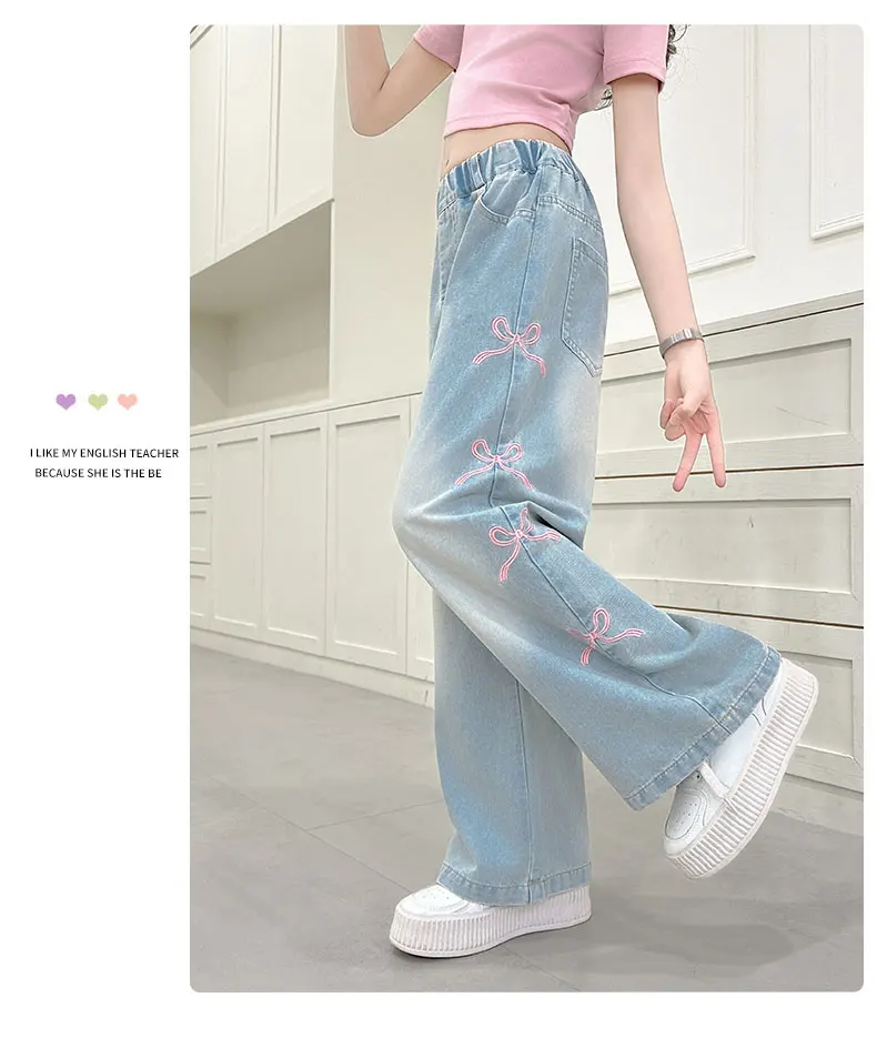 Girls' side pink bow embroidered wide-leg pants 2025 summer thin style slim straight pants suitable for outdoor 5-15 years old