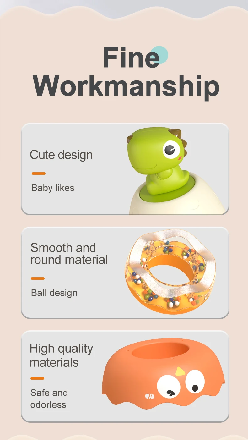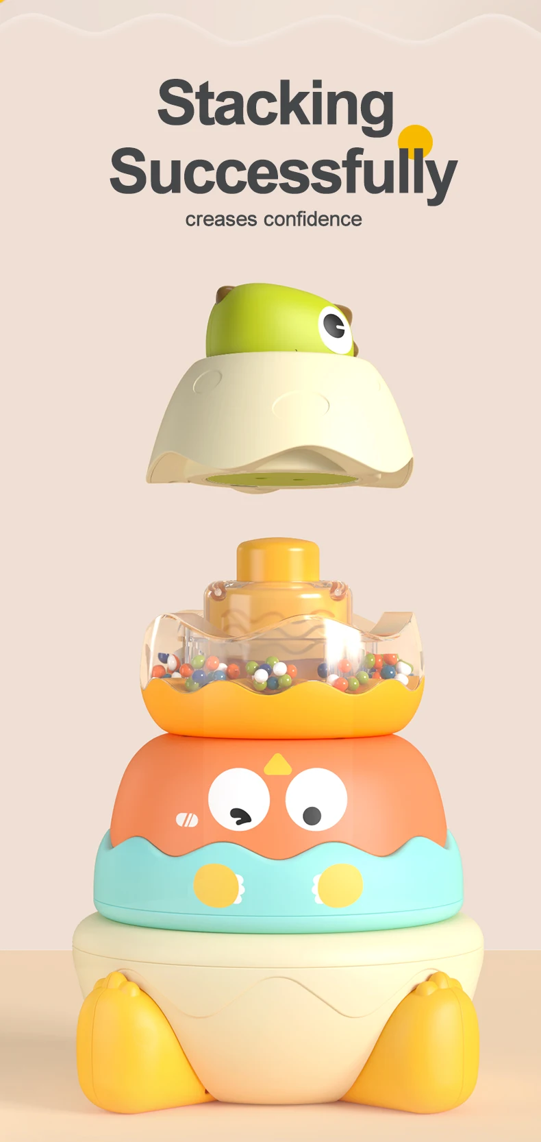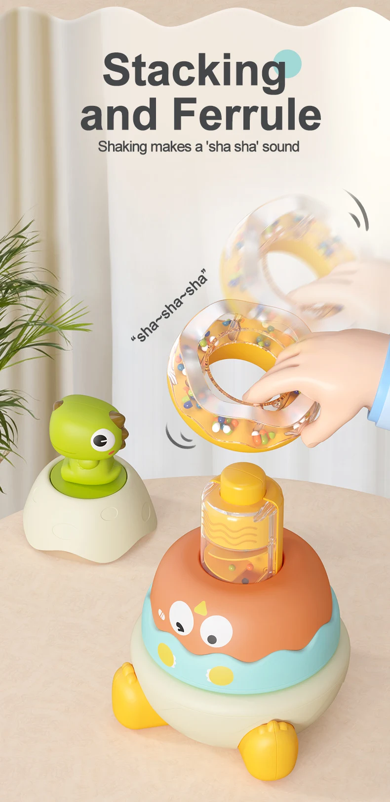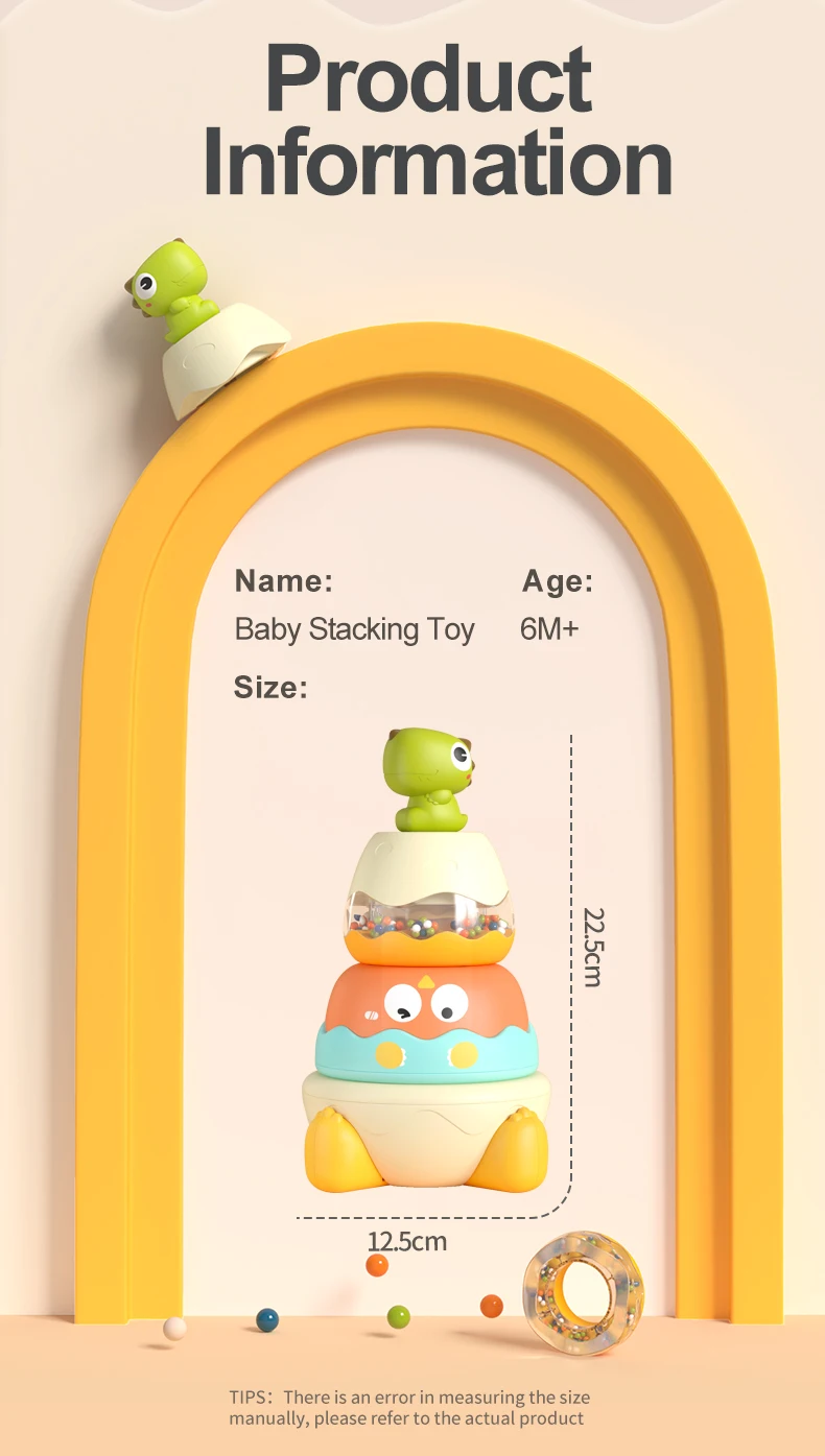 【Cute Appearance】: This cute building rings stacker, cartoon dinosaur shape, comes with circles of different colors and sizes, which can help children recognize colors